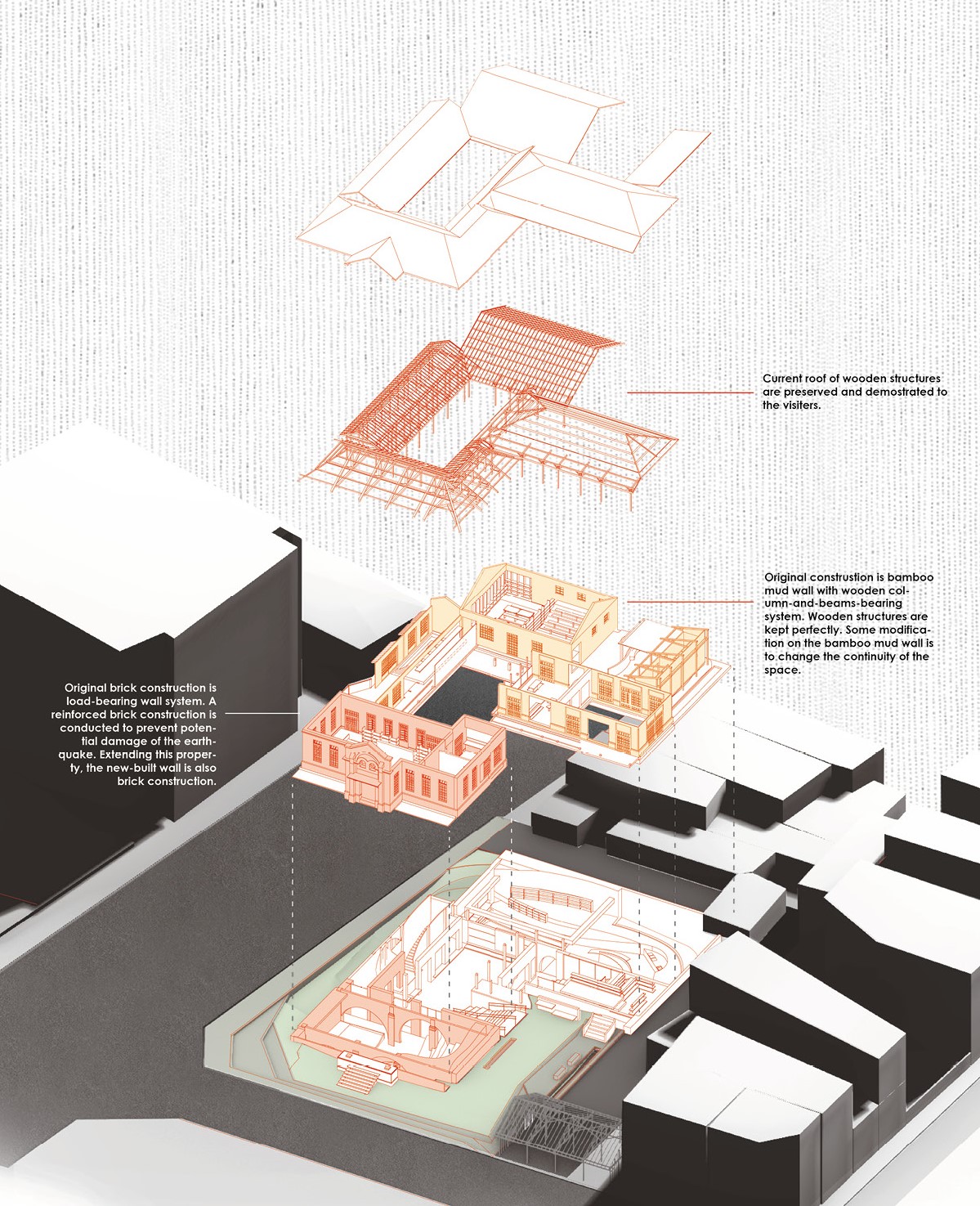 The project aims to be an experiment that rethinks new constructions and buildings' existence. By conflating the new architectural language and old elements, the inconsistency might be dissolved and balanced in the future.